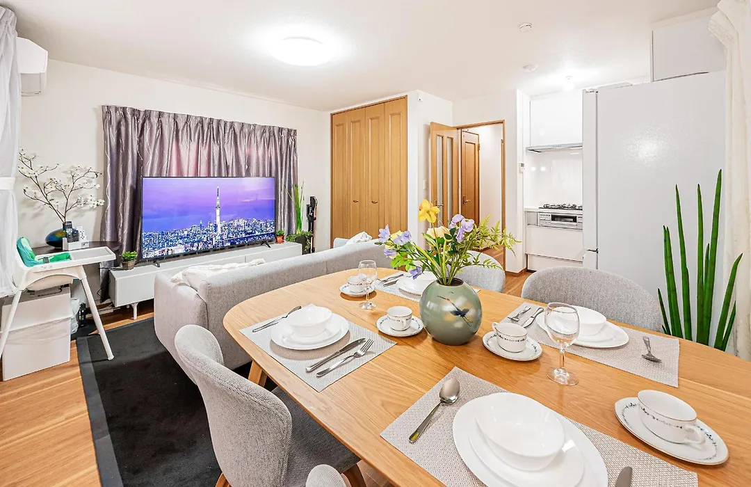 The Tokyo accommodation comes with a bathroom with a bidet, a separate toilet, and a shower. There are a hair dryer, bath sheets, and slippers for guests' comfort.